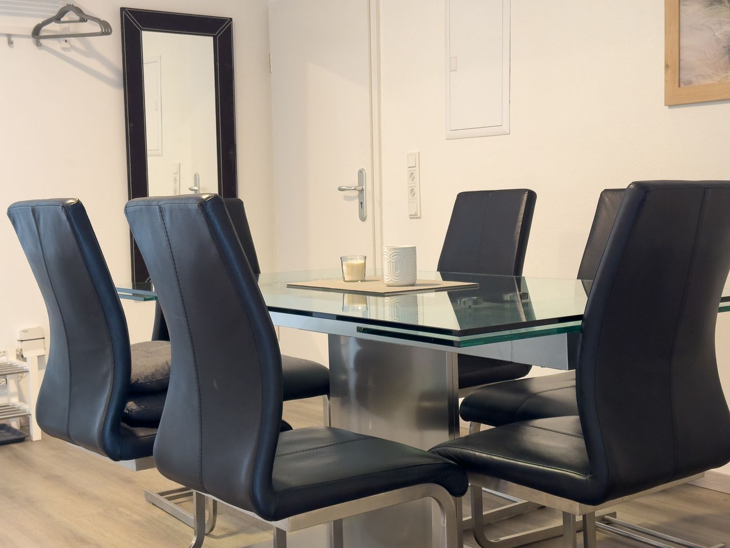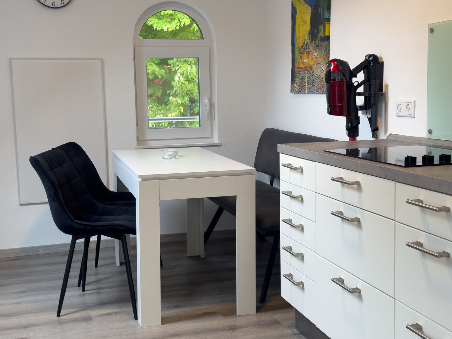 Die geschlossene Küche ist mit einem Esstisch ausgestattet und auf Selbstversorger optimal abgestimmt. Zu den umfangreichen Ausstattungsmerkmalen zählen ein Ceranherd, Backofen, Mikrowelle, Kühlschrank mit Gefrierfach, Spülmaschine, Geschirr und Besteck, Küchenutensilien, sowie verschiedene Kaffee- und Teemöglichkeiten inklusive Nespresso-Maschine, Toaster, Wasserkocher und Radio. Die Essbereiche in Küche und Esszimmer erlauben sowohl das gemeinsame Frühstück als auch ein entspanntes Abendessen.