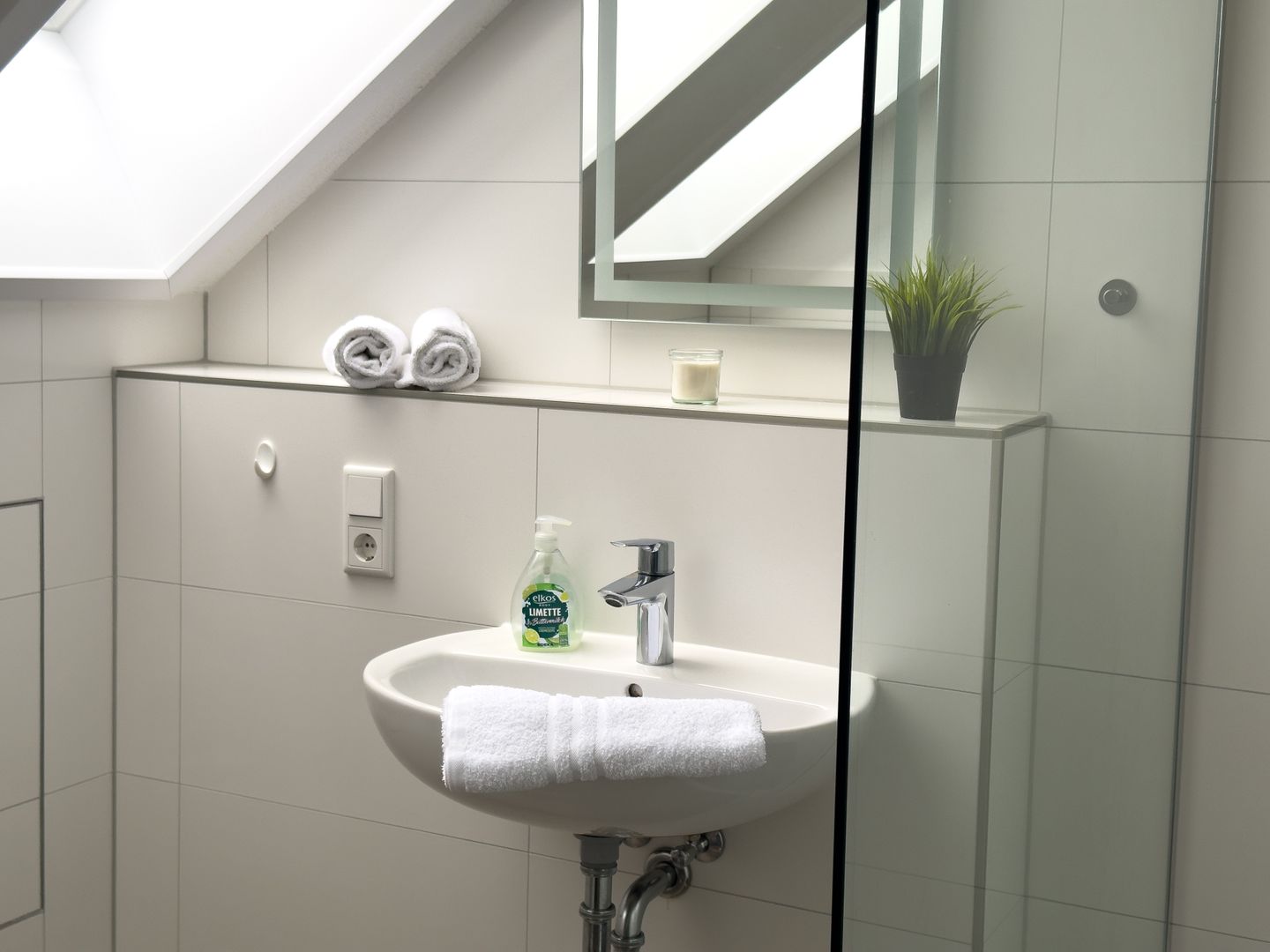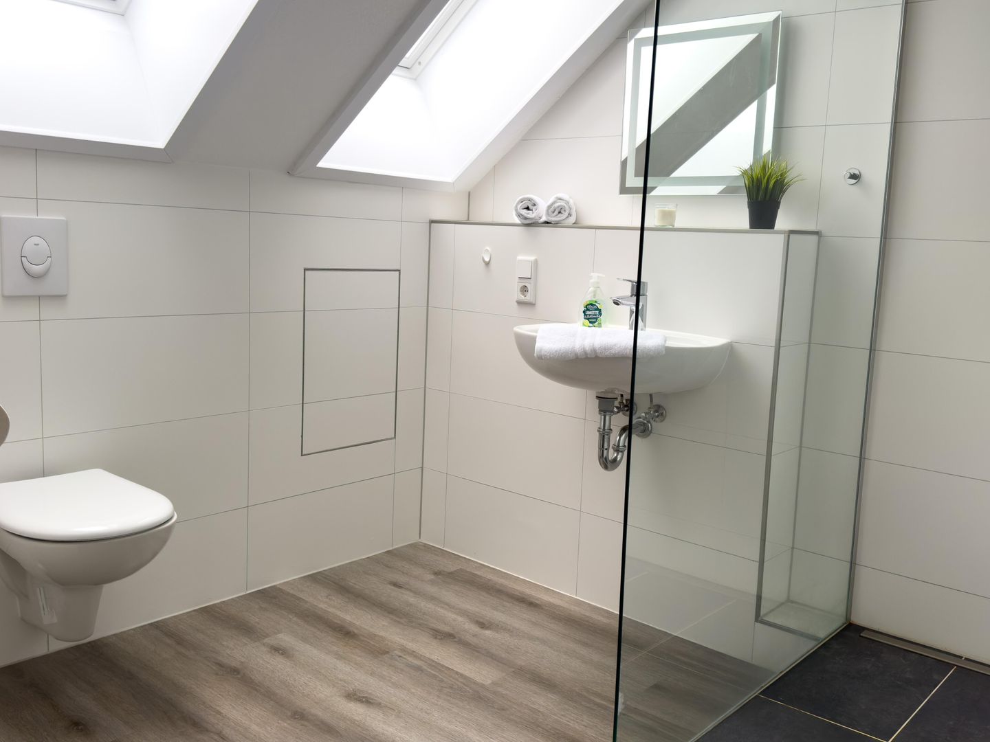 Das moderne Badezimmer verfügt über eine offene Dusche, WC, Waschbecken und Haartrockner. Handtücher für den Küchenbereich werden bereitgestellt. Eine Waschmaschine zur Eigennutzung sowie ein Staubsauger erhöhen den Alltagskomfort.