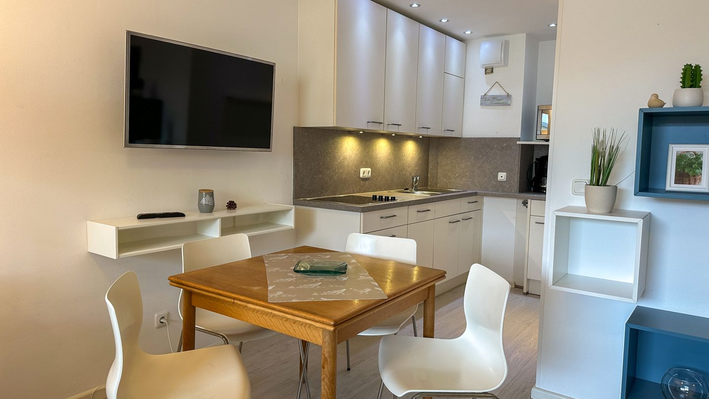 Mit einer Größe von 47 m² ist die Wohnung optimal gestaltet und verfügt über ein ansprechendes Wohnzimmer mit einer gemütlichen Sofaecke, einem Esstisch, sowie einem Flachbild-TV mit digitalem Anschluss. Die offene, voll ausgestattete Küche bietet Ihnen alles, was Sie für die Zubereitung Ihrer Lieblingsgerichte benötigen, einschließlich Herd, Kühlschrank, Spülmaschine, Mikrowelle und einer Kaffeemaschine. Hier können Sie sich nach einem erlebnisreichen Tag ein leckeres Frühstück zubereiten, um gestärkt in den Tag zu starten.