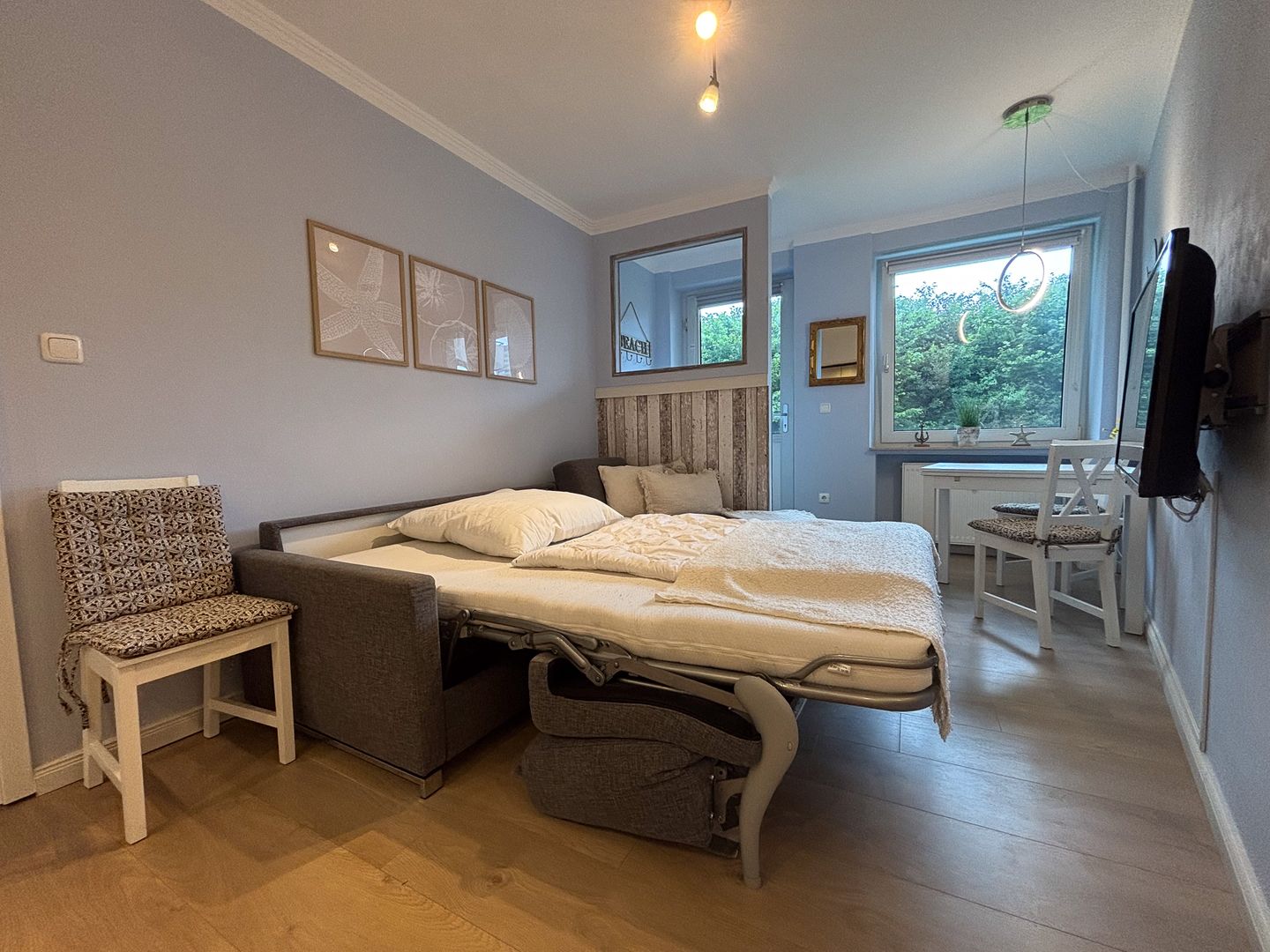 • Wohnbereich mit Schlafcouch, Esstisch und Fernseher