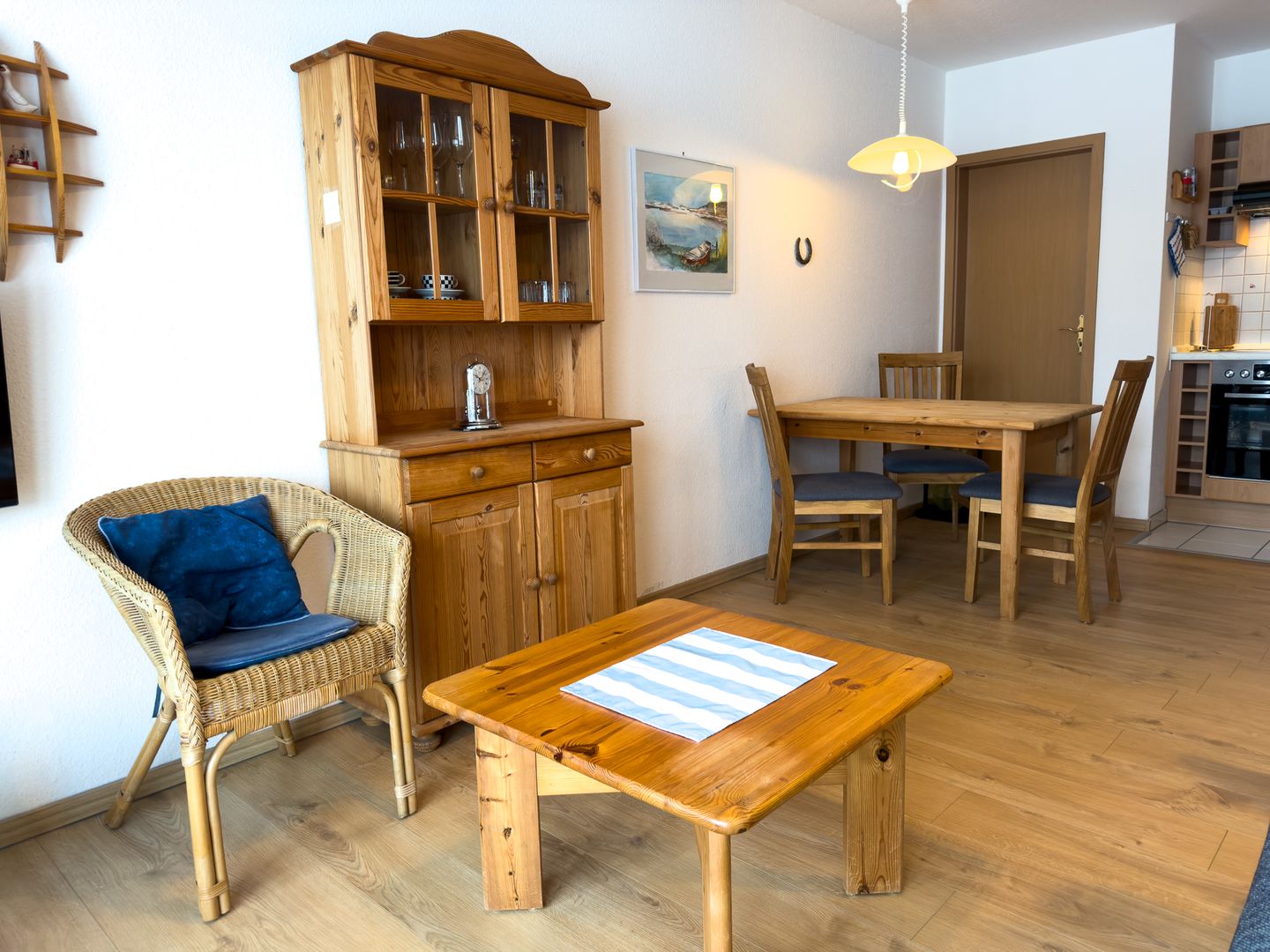 In der Wohnung erwartet Sie ein helles und freundliches Wohnzimmer, das über eine gemütliche Sofaecke verfügt, in der Sie entspannen und entspannende Abende verbringen können. Ein Fernseher in der Größe von 35-44 Zoll sorgt für Unterhaltung. Für gesellige Mahlzeiten steht ein Esstisch zur Verfügung. Die offene Küche ist gut ausgestattet und bietet Ihnen alle nötigen Annehmlichkeiten, um selbst bei Bedarf kulinarische Köstlichkeiten zuzubereiten. Hier finden Sie einen Cerankochfeld, einen Elektrobackofen, einen Kühlschrank mit Gefrierfach, sowie zahlreiche Küchenutensilien, Geschirr und Besteck.